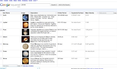 உதாரணத்திற்கு நான் தேடிய planets என்பதற்கு வந்த Earth என்ற முடிவில் படம் ஒரு தளத்திலிருந்தும், விளக்கம் இன்னொரு தளத்திலிருந்தும் கிடைக்கின்றது. உங்களுக்கு அந்தப் படம் வேண்டுமானால் படத்தில் கிளிக்கி அந்தப் படம் உள்ள தளத்திற்குச் செல்லலாம். அது வேறொரு Tap இலேயே திறக்கும். விளக்கத்தை இன்னொரு Tap இல் திறந்துகொள்ளலாம். படமும் விளக்கமும் அதிகமானோரால் விரும்பப்பட்டதாக இருப்பதால் உங்களுக்கு சிறந்ததே கிடைக்கும். இங்கே சென்று Google Squared இனை பரிசோதித்துப் பாருங்கள்.