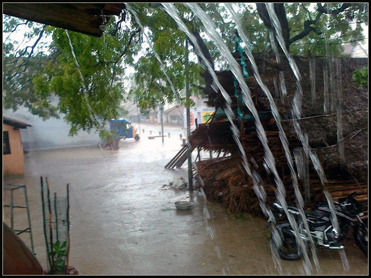 கூரை கிழிசல் வழி ஒழுகும் நீரை தடுத்துக்கொண்டிருக்கும் குழந்தையின் கல்சிலேட்டு..........