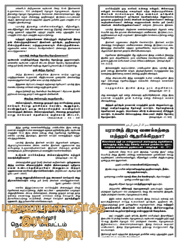 ஷஃபான்15ஆம் இரவில் குறிப்பிட்ட சில அமல்களைச் செய்வதற்கு ஆதாரமுண்டா என்றால் திருமறைக் குர்ஆனிலோ, நபிகள் நாயகம்(ஸல்) அவர்களின் சொல், செயல், அங்கீகாரத்திலோ, அருமை ஷஹாபாக்களின் செயல்களிலோ, தாபீயீன்கள், நான்கு இமாம்கள் வழிமுறைகளிலோ இதற்கு ஆதாரம் எதுவுமில்லை. இப்படிச் செய்வது நன்மையானது என்றால், நம்மைவிட நன்மை செய்வதில் அதிக ஆர்வம் கொண்ட சஹாபாக்கள் இதனைச் செய்திருப்பார்கள். பிற்காலத்தில் தோன்றிய சிலர்தான் இதனை உருவாக்கினர்.