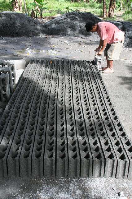 தேவைப்படும் பொருள்கள்: ஜல்லி (கால் இஞ்ச் அளவுள்ளது), கிரஷர் மண்(பவுடர் போல் இல்லாமல், குருணை போல் இருக்க வேண்டும்.) சிமென்ட் (ஓபிசி ரகம்). இதை பயன்படுத்தினால் உற்பத்தி செய்த 4 மணி நேரத்தில் காய்ந்து விடும். சிமென்ட் 4 சட்டி (ஒரு மூட்டை), ஜல்லி 9 சட்டி, கிரஷர் மண் 6 சட்டி எடுக்க வேண்டும். தேவையான அளவு தண்ணீரை தயாராக வைத்திருக்க வேண்டும். மிக்ஸர் மெஷினை இயக்கி, அதில் சிமென்ட் ஒரு சட்டி, ஜல்லி 2 சட்டி, கிரஷர் மண் 2 சட்டி, ஒரு வாளி தண்ணீர் ஆகியவற்றை வரிசையாக கொட்ட வேண்டும். மீண்டும் அதே அளவில் தொடர்ந்து கொட்ட வேண்டும்.