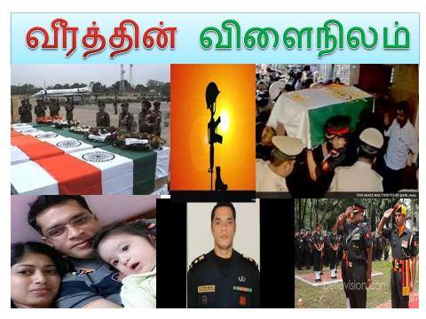 வீரமொன்று தாய்மண்ணை தன் ரத்தத்தால் அலங்கரித்து கண்ணயர்கிறது .................... புதியதாய் ஒரு வெள்ளி .. பூத்து நேசத்துடன் பார்த்துக்கொண்டிருக்கும் இந்த மண்ணை . ................ கோடி விழிகளின் நல்லுறக்கத்திற்காக நீங்கா துயிலுற்றிருந்தன இதுவரை உறங்காது விழித்திருந்த விழிகள் இரண்டு .. .................... இன்னும் எத்தனை உயிர்களை கொன்று எழுதப்படுமோ எல்லைக்கொடுகளின் அரசியல் ....................... காதலுடன் இச்சவப்பெட்டியை சேர்த்தணைக்கிறது தேசிய கொடி . ............................... கண்ணீருடனே .. தலைசாய்க்கின்றன சுதந்திரகாற்றில் .. உதிர்ந்துவிழும் மலர்கள் .....................