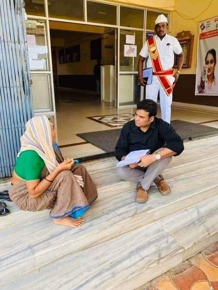 மாவட்ட ஆட்சியர் மாடியிலிருந்து இறங்கி வருகிறார் மூதாட்டி அமர்ந்திருந்த படிகளில் மூதாட்டி அருகே அமர்கிறார்.