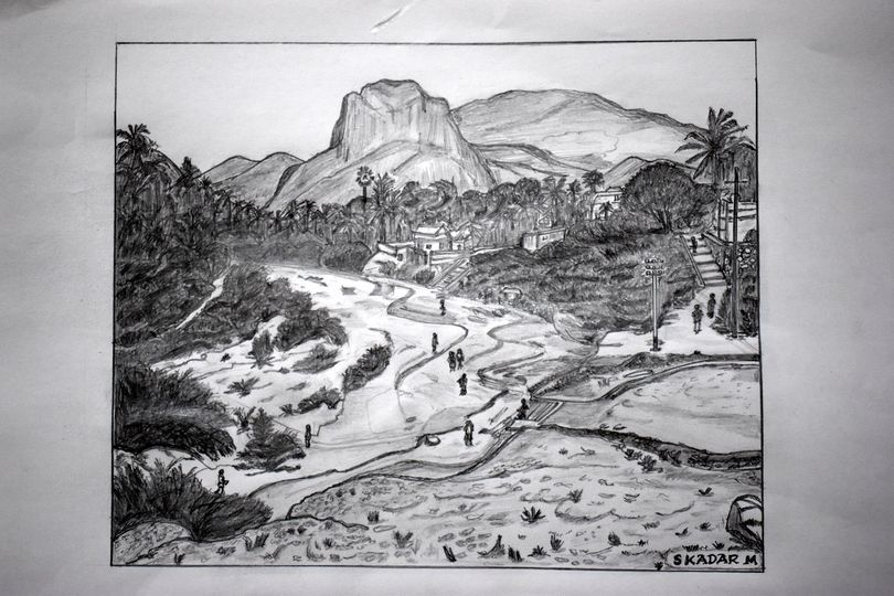 50 வருடங்களுக்கு முந்தைய ஒரு புகைபடத்தை பார்த்து வரைந்தது (வரைபடத்தில் சின்ன சின்னதாய் நிறைய தவறுகள். மன்னிக்கவும்).தூரத்தில் மேற்கு மலை தொடரில், நம்பி மலையில் தோன்றி, எங்கள் ஊர் ஏர்வாடியை தழுவி செல்லும் ஆறு - நம்பி ஆறு.