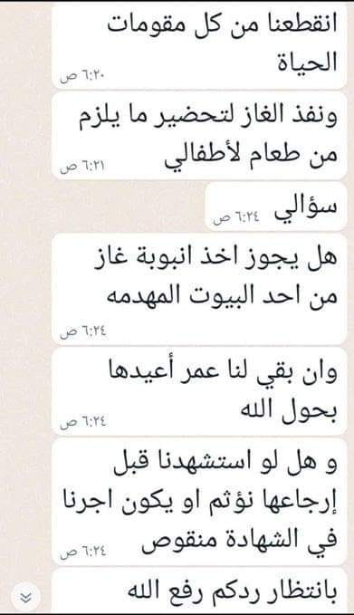 காஸாவைச் சேர்ந்த ஒருவர் மார்க்க அறிஞரிடம் கேட்ட ஃபத்வா (மார்க்க தீர்ப்பு) குழந்தைகளுக்கு உணவை சமைக்க எரிவாயு சிலிண்டர் இல்லை. அருகில் இடிந்து விழுந்த கட்டிடத்தில் உள்ள எரிவாயு சிலிண்டரை எடுத்து பயன்படுத்தலாமா? ஆயுள் மீதமிருந்தால் திரும்ப கொடுத்து விடலாம் . ஆனால் அதற்கிடையில் ஷஹீதானால் இது ஒரு குற்றமாக கருதப்படுமா? அல்லது ஷஹாதத்திற்கு கிடைக்கும் நற்கூலியில் பாதிப்பை ஏற்படுத்துமா? Courtesy: Navas Jane