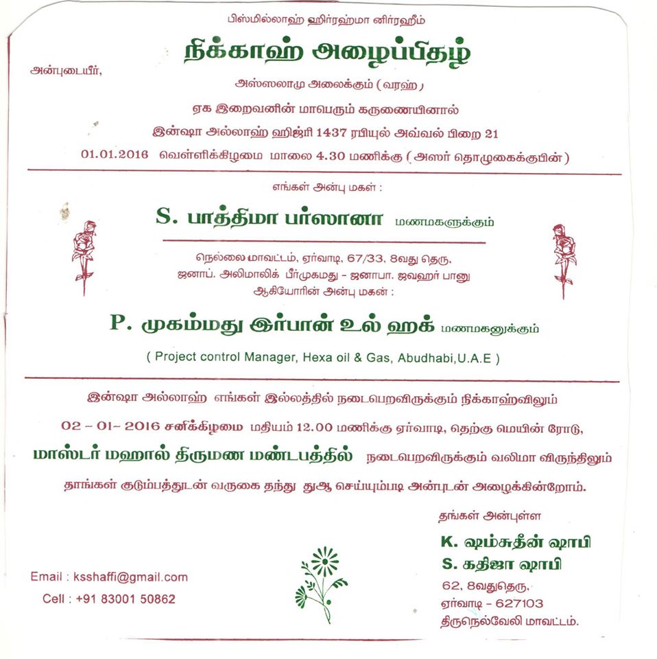 | Marriage of S. Fathima Farsana With P. Mohamed Irfan Ul Haq | |