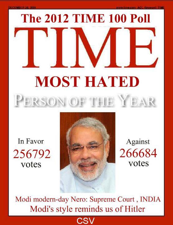 டைம்ஸ் மக்கள் வாக்கெடுப்பில் அதிக எதிர்வாக்குகள் பெற்ற நரேந்திர மோடி! பிரபல டைம் இதழின் உலகின் 100 செல்வாக்கான நபர்கள் 2012 பட்டியலுக்கான மக்கள் வாக்கெடுப்புக்கள் நேற்றுடன் முடிவடைந்துள்ளன.இப்பட்டியலில் தொடர்ந்து முதலிடத்திலிருந்து வந்த இந்திய குஜராத் மாநில முதல்வர் நரேந்திர மோடி இறுதிநேர எதிர்வாக்குகளால் மூன்றாமிடத்துக்கு சென்றுள்ளார். வாக்கெடுப்பு நடைபெற்றுக்கொண்டிருந்த போது, தமக்கு ஆதரவாக வாக்கு சேர்க்குமாறு குஜராத் மக்களிடம் பகிரங்க கோரிக்கை விடுத்து மோசடி செய்ததாக மோடி மீது காங்கிரஸ் கட்சி கடும் குற்றச்சாட்டு முன்வைத்திருந்தது. தன் மீது வேண்டுமென்றே அவதூறு பரப்புவதாக காங்கிரஸ் மீது மோடியும் பதிலுக்கு குற்றம் சுமத்தியிருந்தார். இந்நிலையில் நேற்றுடன் முடிவடைந்த வாக்கெடுப்பின் படி மோடிக்கு அப்பட்டியலில் 256,792 வாக்குகள் ஆதரவாகவும், 266,684 வாக்குகள் எதிராகவும் கிடைத்துள்ளன. இதையடுத்து அப்பட்டியலில் அதிகூடிய எதிர்வாக்குகள் பெற்றவராக நரேந்திர மோடி அடையாளம் காணப்பட்டுள்ளார். முதலிடத்தை Anonymous எனும் இணையத்தள ஹேக்கர்ஸ் குழுவினர் பிடித்துள்ளதுடன், இரண்டாம் இடத்தை Reddit இணையத்தள நிர்வாக இயக்குனரான Erik Martin பிடித்துள்ளார்.எனினும் இப்பட்டியலின் இறுதி முடிவை தீவிர பரிசீலனைக்கு பின்னர் டைம் சஞ்சிகையின் எழுத்தாளர் குழு ஏப்ரல் 17ம் திகதி அறிவிக்கவுள்ளனர். அன்னா ஹசாரே - 23997 , நவநீதம் பிள்ளை - 13790 வாக்குகள் பெற்றுள்ளனர். இந்த ஆண்டு அதிக எதிர் வாக்குக்கள் பெற்றவர் மோடியே ஆவார். 2002 ஆம் ஆண்டு இஸ்லாமிய இனப்படுகொலையில் மோடிக்கு தொடர்பு உள்ளதால் இஸ்லாமியர்கள், மனித உரிமை ஆர்வலர்கள் பலரும் மோடிக்கு எதிராக வாக்களித்துள்ளனர். இதன் இறுதி முடிவி ஏப்ரல் 17 தேதி வெளிவருகிறது. The LIST: http://www.time.com/time/specials/packages/article/0,28804,2107952_2107959,00.html