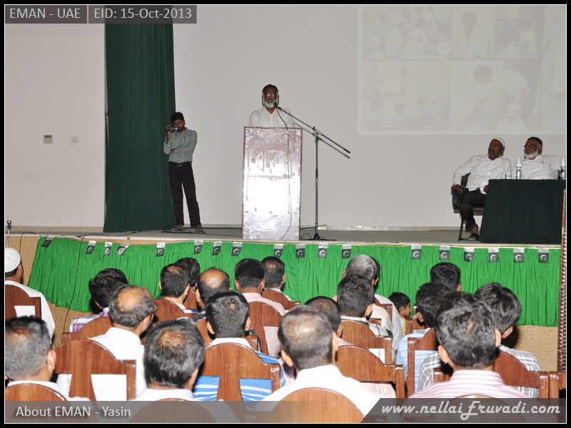 அளவற்ற அருளாளன் நிகரற்ற அன்பாளன் அல்லாஹ்வின் திருப்பெயரால் நெல்லை ஏர்வாடி சகோதரர்களால் 1978 ஆம் ஆண்டு அமீரகத்தில் ஏர்வாடி முஸ்லிம் சங்கம் ( Eruvadi Muslim Association - EMAN) ஆரம்பிக்கப்பட்டது.இந்த சங்கத்தின் சார்பாக இந்த வருடம் ஹஜ் பெருநாள் சந்திப்பு நிகழ்ச்சி ஹஜ் பெருநாள் தினத்தன்று ( 15.10.2013, செவ்வாய்கிழமை) துபையில் நடைபெற்றது.