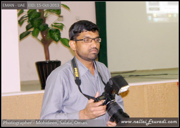 நிகழ்ச்சிக்கான புகைப்படங்களை, ஈமானுக்கான அழைப்பிதழ்கள் மற்றும் சுவரொட்டிகளை சிறப்பாக வடிவமைத்துத் தரும் சகோதரர் முகைதீன்( LV street) அவர்கள் எடுத்தார்கள். இவர் ஓமானில் சலாலாவில் பணி புரிந்து வருகிறார். நிகழ்ச்சி சம்பந்தமான கருத்துக்கள் மற்றும் ஆலோசனைகளை emandubai@gmail.com என்ற முகவரிக்கு அனுப்பும்படி கேட்டுக் கொள்கிறோம். மேலதிக புகைப்படங்களை கீழ்கண்ட சுட்டியில் காணலாம். http://www.nellaieruvadi.com/eman/photos.asp?dNam=83_2013_EID-I http://www.nellaieruvadi.com/eman/photos.asp?dNam=83_2013_EID-II