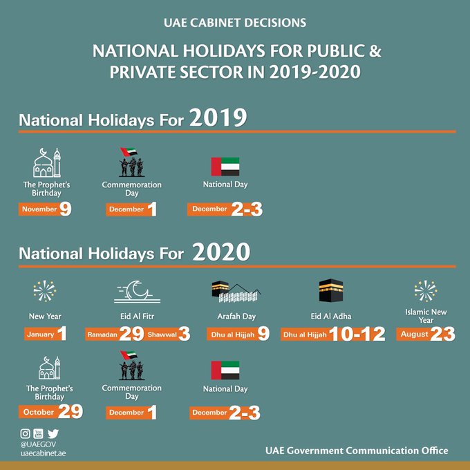 Dubai: The UAE cabinet has approved unified national holidays in the year 2019 and 2020 for public and private sectors on Thursday.