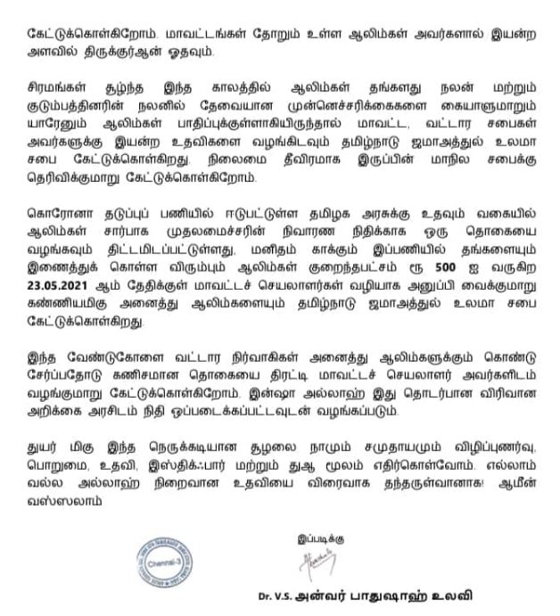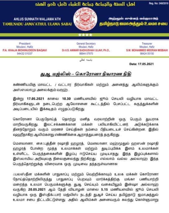 துஆ மஜ்லிஸ், கொரொனா நிவாரண நிதி - ஜமாத்துல் உலமா ![]()