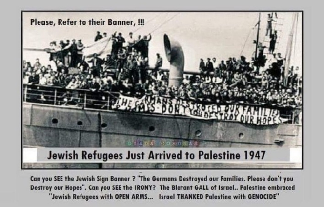 1947இல் ஃபாலஸ்தீனத்திற்கு வந்த யூத அகதிகளின் கப்பலிலிருந்த பேனர்: ஜெர்மனியர்கள் எங்களாது குடும்பங்களை நாசப்படுத்திவிட்டனர். தயவு செய்து எங்களது நம்பிக்கையை வீணடித்துவிடாதீர்கள். இரக்கத்துடன் அவர்களுக்கு இடமளித்த ஃபலஸ்தீனியர்களி இன்று இரக்கமற்ற முறையில் கொன்று குவித்து அவர்களை சொந்த நாட்டிலிருந்தே துரத்துகின்றனர். இது தான் யூதர்களின் உண்மை முகம். |