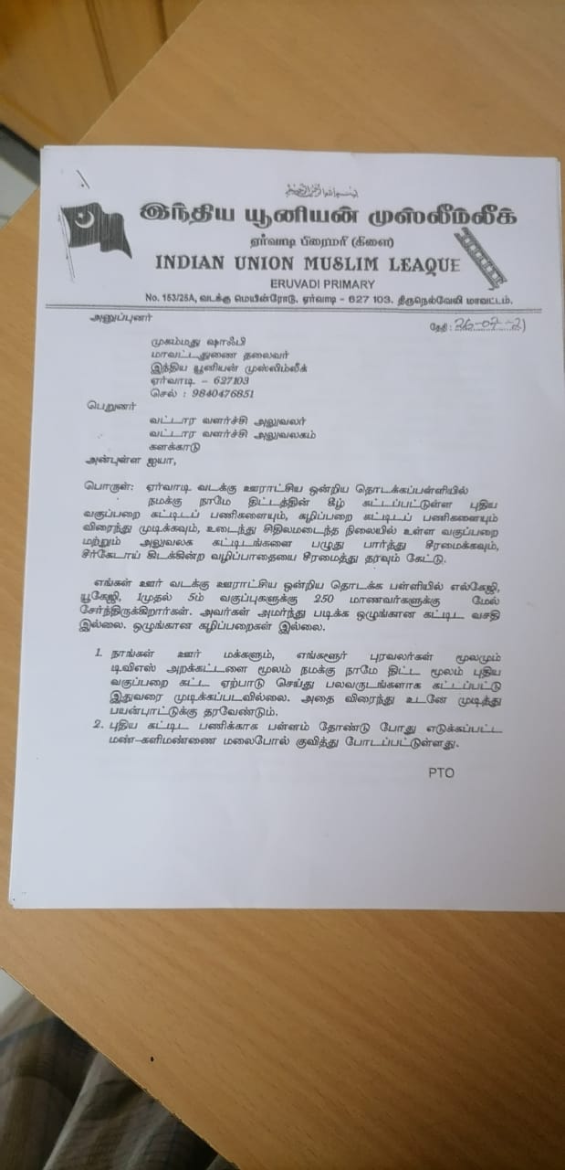 சமூகப்பணியில் இந்திய யூனியன் முஸ்லீம் லீக் ஏர்வாடி பிரைமரி ஏர்வாடிவடக்கு ஊராட்சி ஒன்றிய தொடக்கப்பள்ளி பல வருடங்களாக சரியான பராமரிப்பு இல்லாமல் பல கட்டிடங்கள் பழுதடைந்துள்ளது இவைகளில் மாணவர்கள் அமர்ந்து படிக்க இயலாத நிலையில்இருந்தது ஆகவே அவைகளுக்கு முறையான கட்டிடம் வேண்டும் என்று இரண்டு வருடங்களுக்கு முன்பு தலைமையாசிரியர்அவர்கள் கேட்டுக்கொண்டதின் பேரில் ஏர்வாடி பிரைமரி நிர்வாகிகள் மாவட்ட துணைத் தலைவர் ஹாஜி முகம்மது ஷாஃபி அவர்கள் தலைமையில் களத்தில் இறங்கி ஏர்வாடி புரவலர் சிட்டிகோல்டூ ஹாஜி முஸ்தபா மற்றும் டிவிஎஸ் அறக்கட்டளை நிர்வாகிகளை தொடர்புகொண்டு நமக்கு நாமே திட்டத்தில் ஊர்மக்களின் பங்களிப்பாக 5 லட்சம் ரூபாய் செலுத்தி கட்டிடம் கட்ட ஏற்பாடு செய்யப்பட்டது. இதுவரை கட்டி முடிக்கப்படாத நிலையில் மேலும் சில கட்டிடங்கள் பழுதடைந்த நிலையில் உள்ளதாலும் அதனையும் சீரமைத்து தரும்படியும் கேட்டு கடந்த ஜூலை மாதம் மாவட்ட துணைத் தலைவர் ஹாஜி முகம்மது ஷாஃபி அவர்கள், வட்டார வளர்ச்சி அலுவலர் திரு.பிச்சையா அவர்களைதொடர்பு கொண்டு அவரை பள்ளிக்கூடத்திற்கு வரவழைத்து பள்ளி கட்டிடங்களின் அவல நிலையை எடுத்துக்காட்டி புகார் மனு ஒன்றை அளித்தார். வட்டார வளர்ச்சி அலுவலர்அவர்கள் உடனடியாக பணியை முடித்து தருவதாகவும் கட்டிடங்கள் ssa திட்டத்தில் ஏற்பாடு செய்வதாகவும் உறுதி அளித்தார் அதன் அடிப்படையில் மா.து. தலைவர்அவர்கள் தொடர்ந்து கண்காணித்து வேகமாக முடிக்க ஏற்பாடு செய்தார்கள். இப்போது மூன்று வகுப்பறைகளுடன் கூடிய ஒரு கட்டிடம் மற்றும் மாணவிககளுக்கான கழிப்பறையும் கட்டி முடிக்கப்பட்டுள்ளது மேற்கொண்டுள்ள கட்டிடங்களை செப்பனிட்டு பராமரித்தல் பழைய கட்டிடங்கள் எடுத்துவிட்டு புது கட்டிடம் கட்டுவதற்கு ஏற்பாடு செய்வதற்கும் மாவட்டத் தலைவர் ஜனாப் அவர்கள் L.K.S.மீரான் அவர்கள் தலைமையில் மாவட்ட ஆட்சியரை கண்டு ஏற்பாடு செய்யவும்முடிவுசெய்யப்பட்டது. மேலும் கொரோனா காலகட்டத்தில் மாணவமாணவிகள்மற்றும் பெற்றோர்கள் மிகவும் மன அழுத்தத்தில்இருந்ததின் காரணமாக பலகுடும்பங்களில் பிரச்சனைகள் ஏற்பட்டுஇருப்பதைகருத்தில் கொண்டு இ.யூ முஸ்லிம் லீக்மகளிர் அணியின் மூலமாக மனநிலை மருத்துவர்கள் மூலம் மன நல ஆலோசனை ஆலோசனைக் கூட்டம் நடத்த ஏற்பாடு செய்யவும் தீர்மானிக்கப்பட்டது.