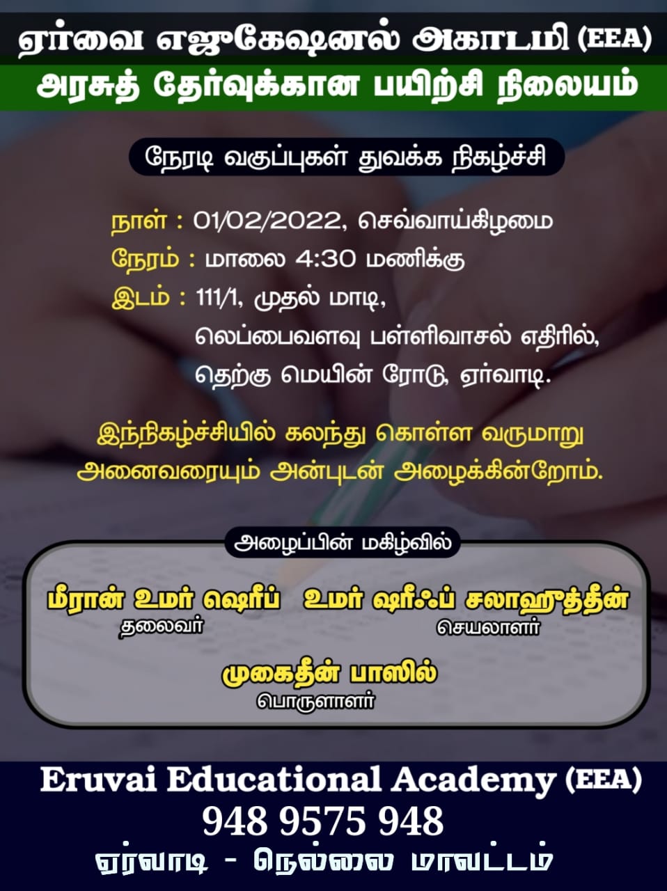 அஸ்ஸலாமு அலைக்கும், நமது ஊர் மாணவ, மாணவிகளை அரசுத் தேர்வுக்கு தயார்படுத்திட வேண்டும் என்ற உன்னத நோக்கத்தோடு நாம் துவங்கி இருக்கும் ஏர்வை எஜுகேஷனல் அகாடமியின் "நேரடி வகுப்புகள் துவக்க நிகழ்ச்சி" ஓமிக்ரான் ஊரடங்கு மற்றும் உள்ளாட்சி தேர்தல் நடத்தை விதிகள் காரணமாக சிறிய அளவிலான எளிய நிகழ்ச்சியாக இன்று (1-Feb) மாலை 4:00 மணிக்கு லெப்பை வளவு பள்ளிவாசல் எதிரில் 111/1 மாடியில் வைத்து நடைபெற உள்ளது. குறுகிய காலகட்டத்தில் நிகழ்ச்சி ஏற்பாடு செய்யப்பட்டதால் உங்கள் அனைவரையும் நேரில் சந்தித்து அழைக்க இயலவில்லை. இந்த "e" அழைப்பை நேரடி அழைப்பாக ஏற்றுக்கொண்டு என்றும்போல் உங்களுடைய ஆதரவினையும், மேலான ஆலோசனைகளையும் வழங்கிடுமாறு அன்போடு கேட்டுக்கொள்கின்றோம். அழைப்பின் மகிழ்வில், நிர்வாக கமிட்டி 948 9575 948