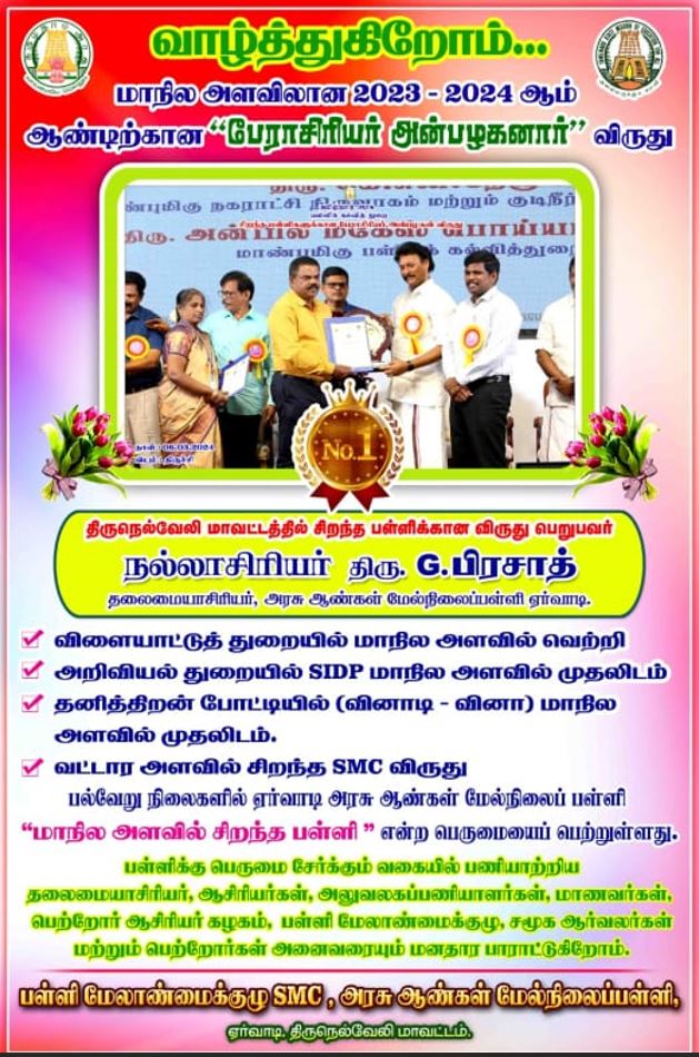 ஏர்வாடி ஆண்கள் மேல் நிலைப்பள்ளி தலைமையாசிரியருக்கு நல்லாசிரியர் விருது |
